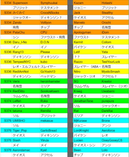 https://www.start.gg/tournament/evo-2024/event/guilty-gear-strive Liquipediaに強豪・有名人のキャラ入りリストが掲載されている。参考にした。ここでは省略するが現状での欠場情報も記載されている。https://liquipedia.net/fighters/Evolution_Champio…